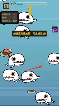 2、游戏中,按提示躲避高等级鲲(箭头指向),吞噬低等级同类,提升等级。