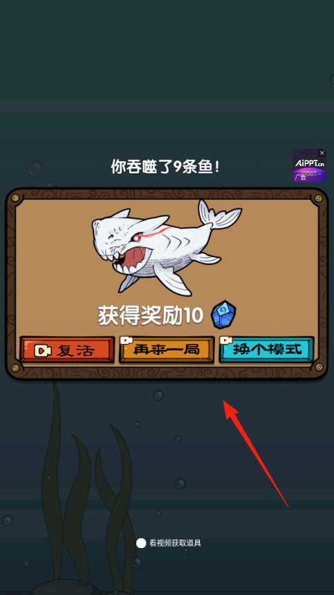 3、结算界面(吞噬9条鱼),可点“再来一局”继续,或换个模式”,用奖励强化鲲。