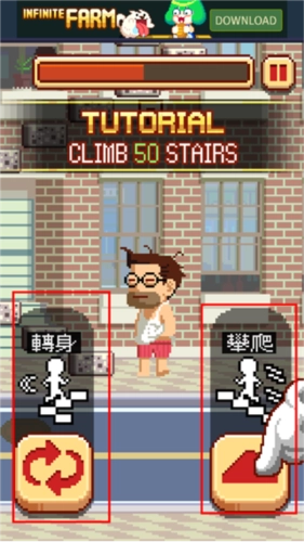 界面左右两侧的红框分别对应转身与攀爬功能,你需要借助这两个按钮来完成移动、攀爬之类的基础操作。