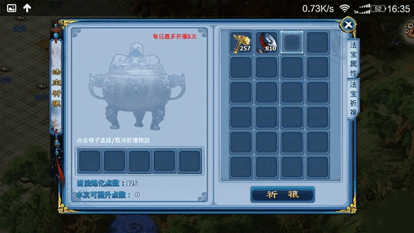 冰冻三尺非一日之寒,法宝也和天命系统类似,得通过升级才能实现实力的大幅提升。这就需要每天进行祷告,每日祷告五次可获取提升点。目前阶段,除了系统初始赠送的石头能通过使用获得10000提升值外,就只能依靠消耗玄铁和锤子来获取点数了。所以不必再为锤子和玄铁占用包裹空间而烦恼,这些都是升级必不可少的材料。