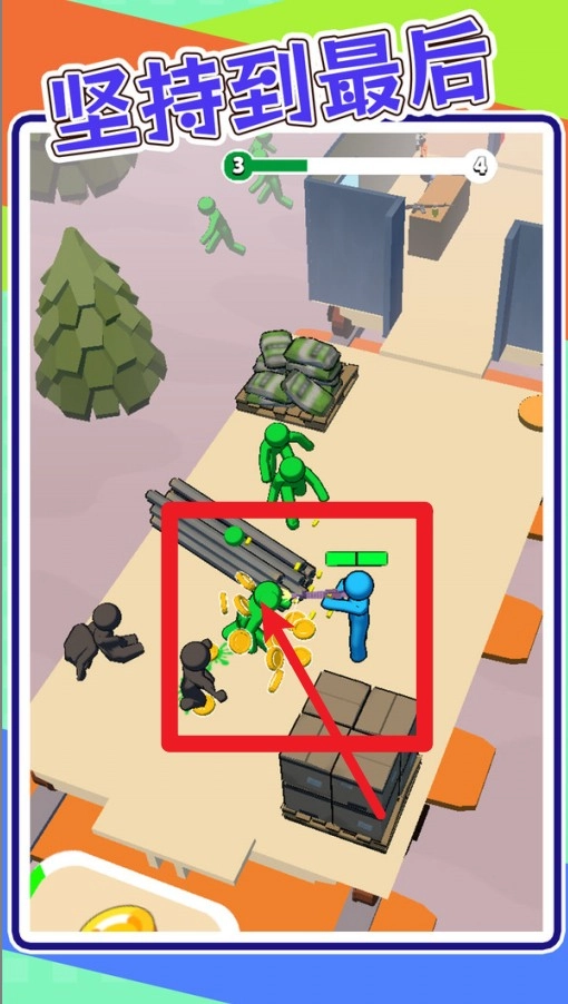 玩家激战正酣,击败绿色僵尸后会掉落金币,玩家得及时拾取这些资源,好用来给后续的武器和角色升级。