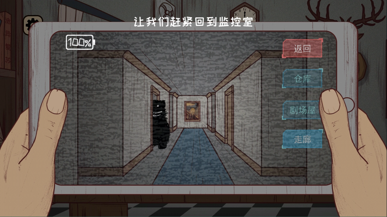 回到监控室后,先点击左边的灯光按钮查看情况,如果发现对方在门口,就要马上点击右边的关门键进行阻拦。