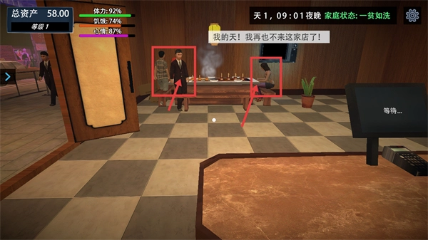 留意【总资产-58.00】【等级1】,当出现【开业】标识时,依据提示【点击关闭或打开商店】来启动当前的经营流程。