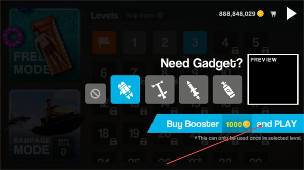 选择关卡后会弹出NeedGadget界面,此时点击BuyBooster按钮,消耗1000金币购买增益道具,就能进入关卡;该道具在单个关卡中仅可使用一次,能够提升鲨鱼在关卡中的表现。