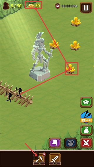 在战斗过程中收集【50】类资源,部署部署成本为【150】的兵种,依靠雕像区域来推进,并且留意【00:00:05s】的计时。