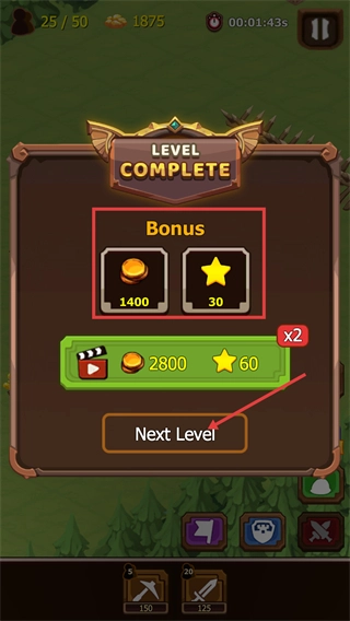 完成关卡后可获得【Bonus】奖励,包含【1400】金币与【30】星星,点击【NextLevel】即可挑战下一关。