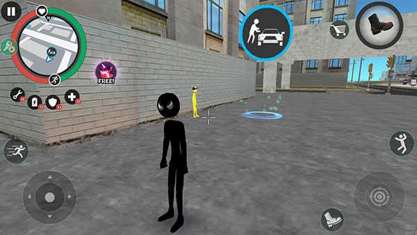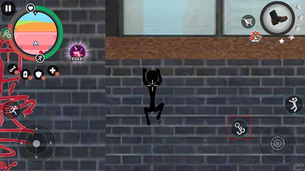 点击左侧摇杆可操控火柴人移动,点击右侧钩子能化身蜘蛛侠自由穿梭,点击“人”形图标可实现跳跃,点击瞄准镜图标则能发起攻击。