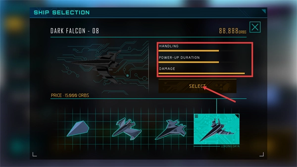 在【SHIP-SELECTION】界面,可消耗【15000-ORBS】解锁【DARK-FALCON-08】,该载具的【HANDLING】等属性更为出色,点击即可选定此载具。