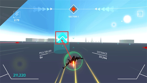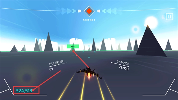 在【SECTOR-1】关卡里,驾驶载具收集【蓝色箭头】道具,让【MULTIPLIER】数值提升到5倍,【DISTANCE】的累计数值达到了23244。