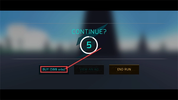关卡结束后会弹出【CONTINUE?】界面,此时可以消耗【500-ORBS】继续挑战,也能通过观看广告或选择【END-RUN】来结束这一轮。