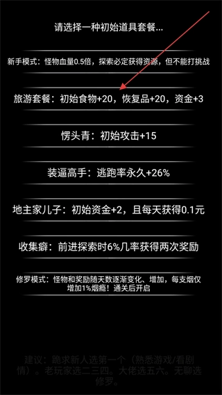在初始道具套餐的选择界面中,选择旅游套餐能够获得初始食物等资源,新手玩家可以先选择新手模式来熟悉游戏玩法。