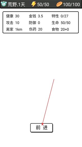 当进入荒野场景时,点击前进按钮可以继续探索进程,在此期间要时刻关注自身的健康值、食物储备等状态指标,以确保能够顺利生存下去。