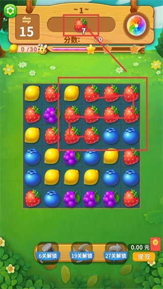 这一关需要收集草莓,找到【草莓-聚集区域】来消除,目前【分数-7】还得提高,另外要留意【6关解锁】【19关解锁】的后续关卡要求。
