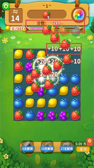 消除【草莓】后获得【+10-加分】,当前【分数-210】大幅提升,继续瞄准同类元素聚集处消除,加快目标收集进度。