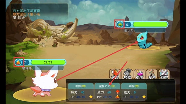 在对战过程中,当我方派出【喵宝宝】、敌方派出【怪小毛】时,要优先使用【星星之火】技能(该技能威力为60),同时需要留意【PP】值的剩余情况。