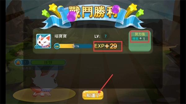 战斗获胜后,【喵宝宝】能得到【EXP+29】和【努力值+1】,点击【知道了】关闭该界面即可继续游戏。
