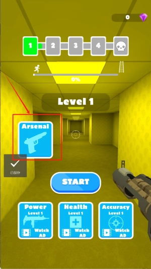 进入游戏后选择“Level 1”难度,留意左下角武器栏里的手枪图标,点击“Arsenal”就能切换其他武器,为战斗做好准备。