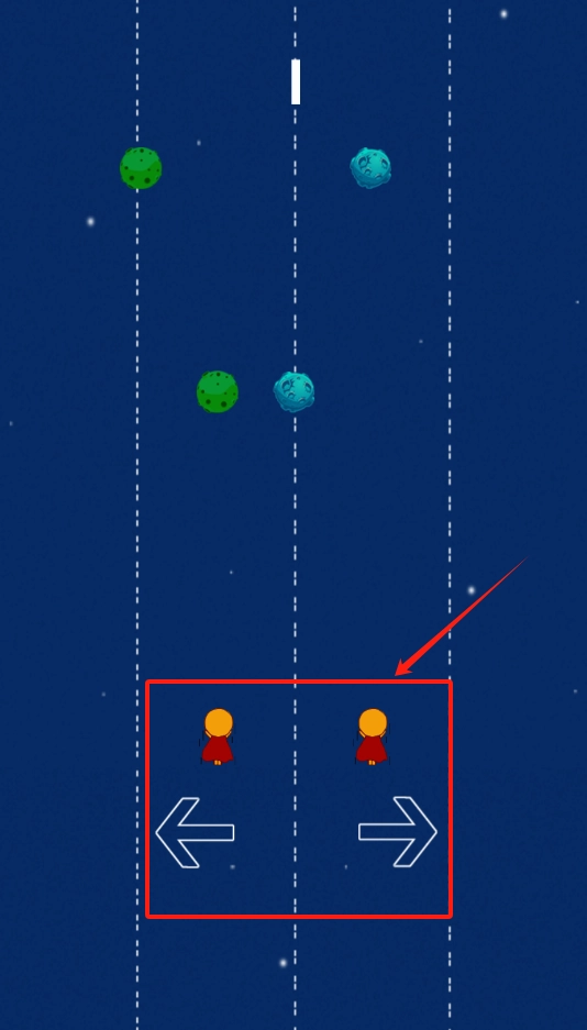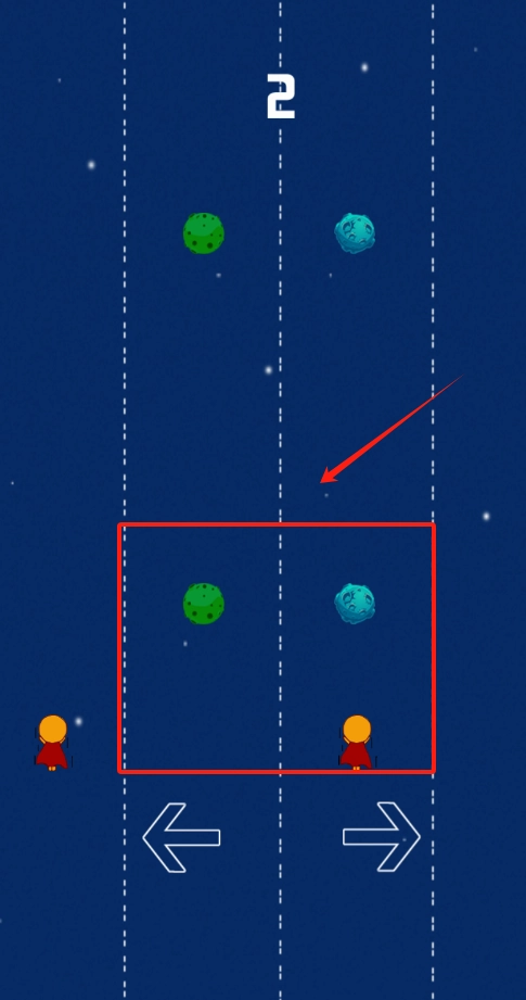 左右箭头用来操控角色移动,中间那个红框区域得留意,要避开上方那些彩色星球障碍物。