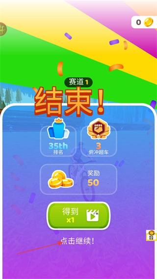 抵达终点后,可查看自己的排名、超车次数以及获得的奖励,随后点击“继续”按钮,即可进入下一个场景。