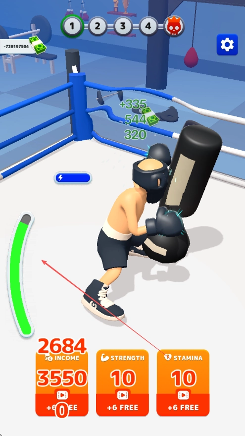 通过滑动屏幕来操控角色挥拳击打沙袋,要留意观察箭头所指向的能量条上的数值显示。