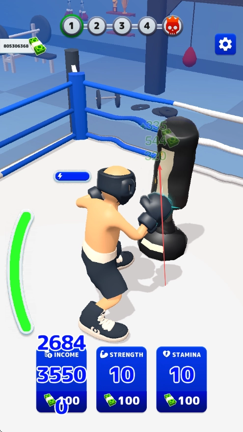 用赚到的钱点击属性按钮来升级STRENGTH和STAMINA,以此增强角色的能力,最终完成MUSCLEUP!的目标。