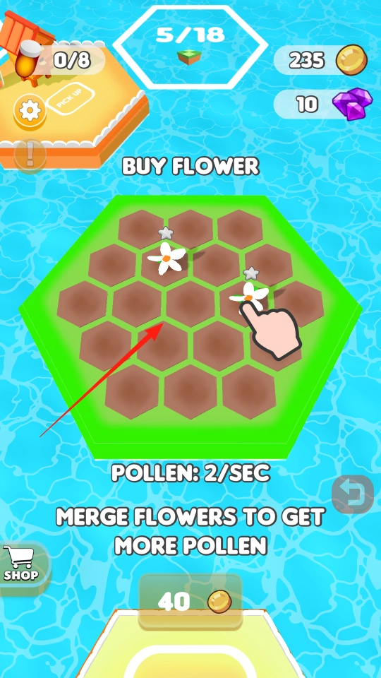 拖动相同的花朵进行合并,合并后能提高花粉的产出量,通过积累资源来推动游戏的进展,从而体验合成带来的增益机制。